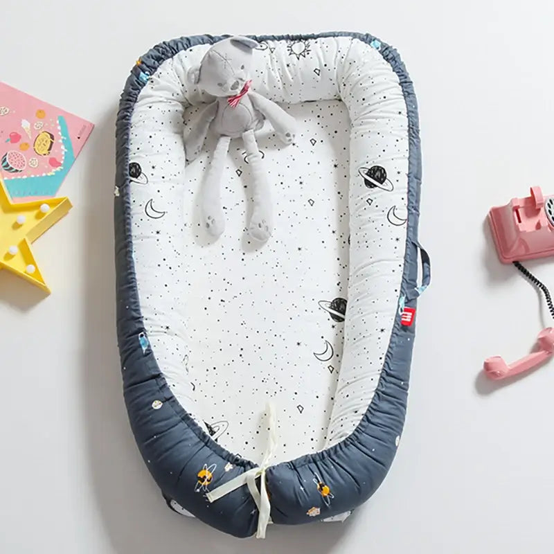 Zacht, comfortabel en draagbaar babybed met een 3D high-density bodemkussen dat een extra kussen voor de baby vormt. Het babybed heeft beschermende vulling aan de zijkanten, waardoor er een aparte slaapzone ontstaat voor samen slapende baby's met een gevoel van veiligheid en geborgenheid.