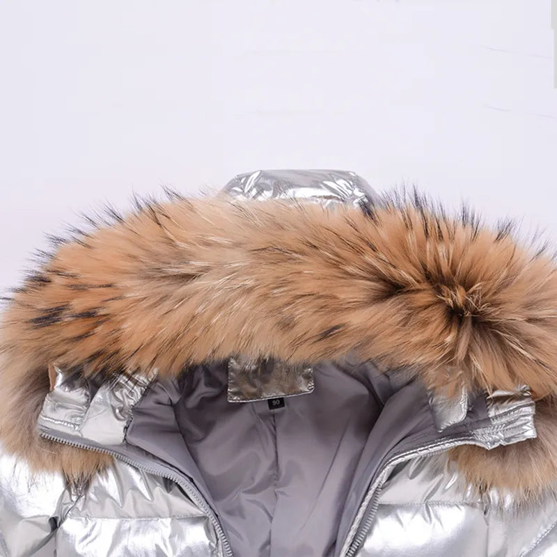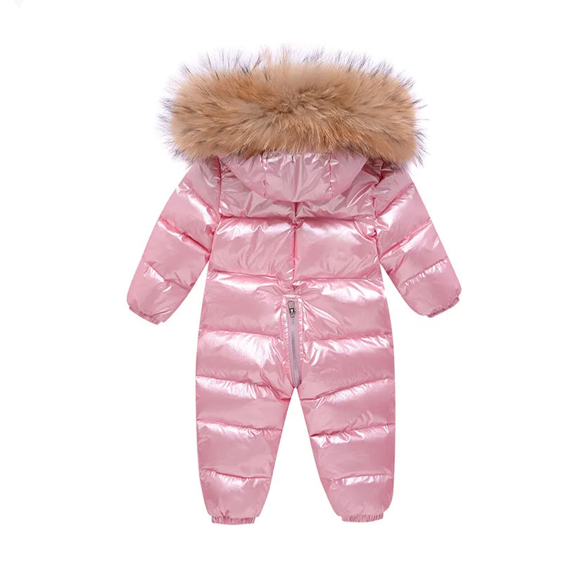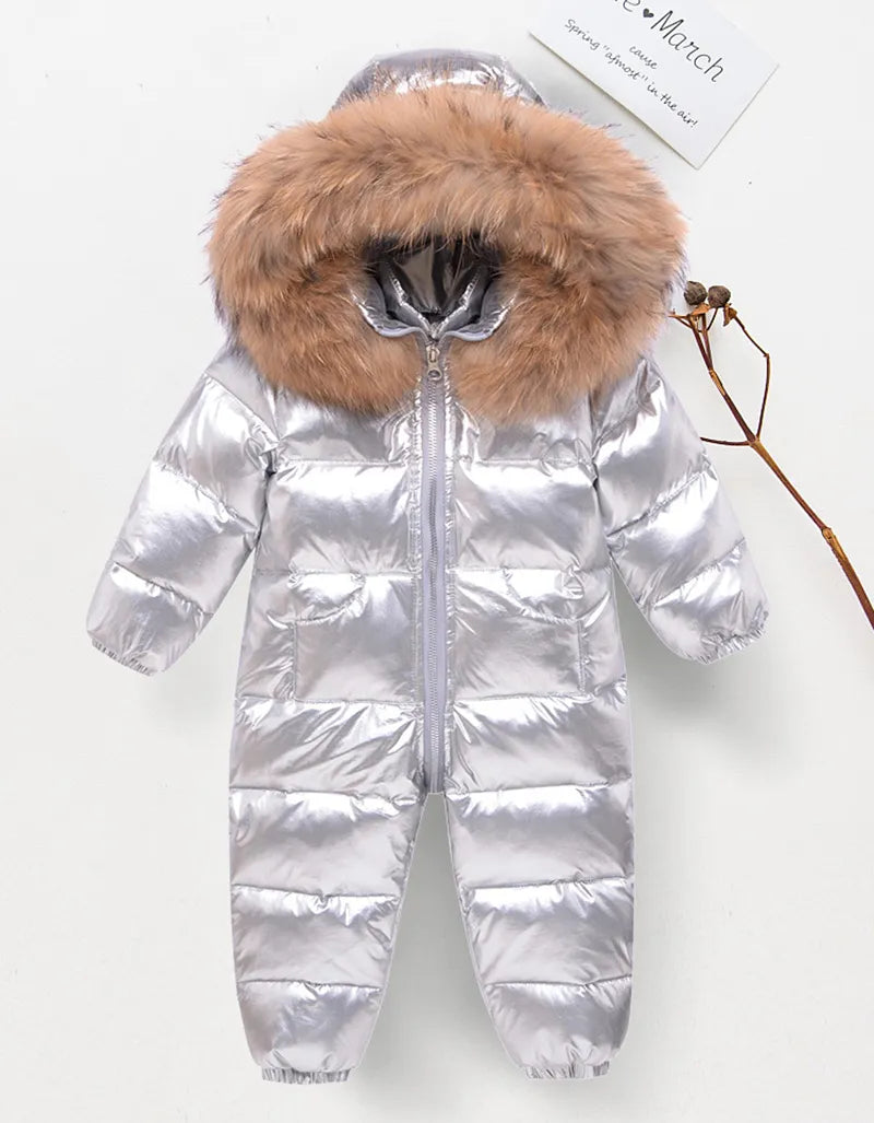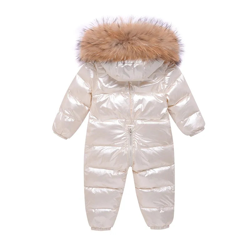 Stijlvol en praktisch baby-sneeuwpakje om je kleine engel warm te houden bij koud en winderig weer. De buitenlaag is gemaakt van hoogwaardig polyester en gevuld met eendendons. De elastische manchetten en afneembare capuchon houden de baby warm en beschermd als je buiten bent.