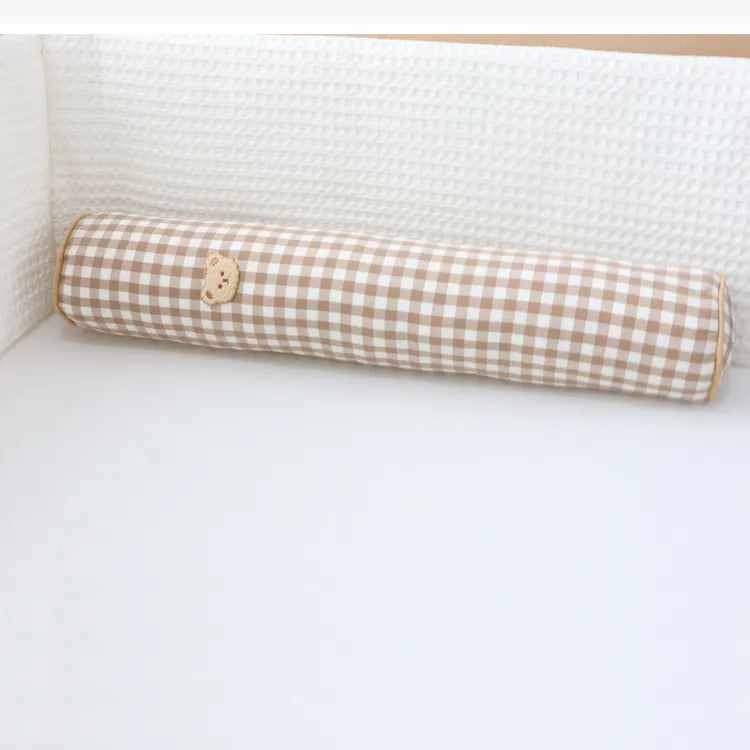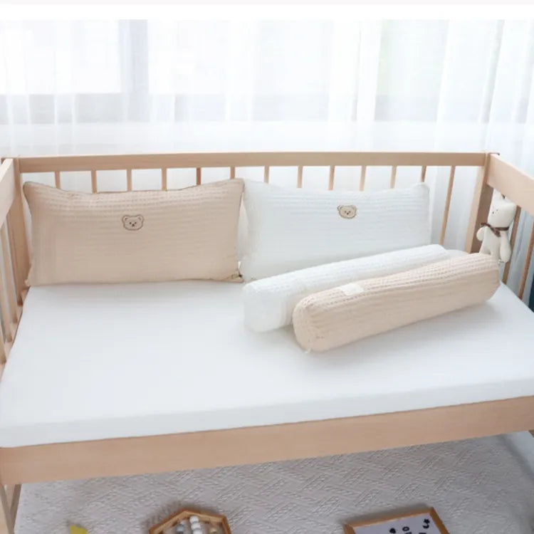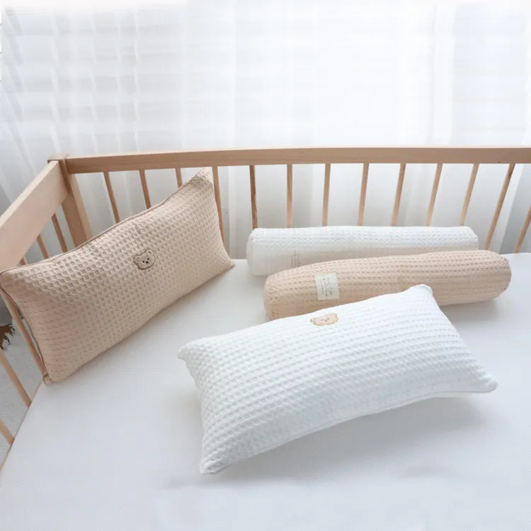 Soft and fluffy baby pillows in rectangular and cylindrical shapes provide cozy support and cushioning for a baby's head and body while preventing head bumps or tipping over the bed. Made of 100% cotton fabric in plain and waffle weave texture with a embroidered bear motif. These snuggly bedside pillows are not just soothing and comforting for babies but also perfect for tummy time play.
