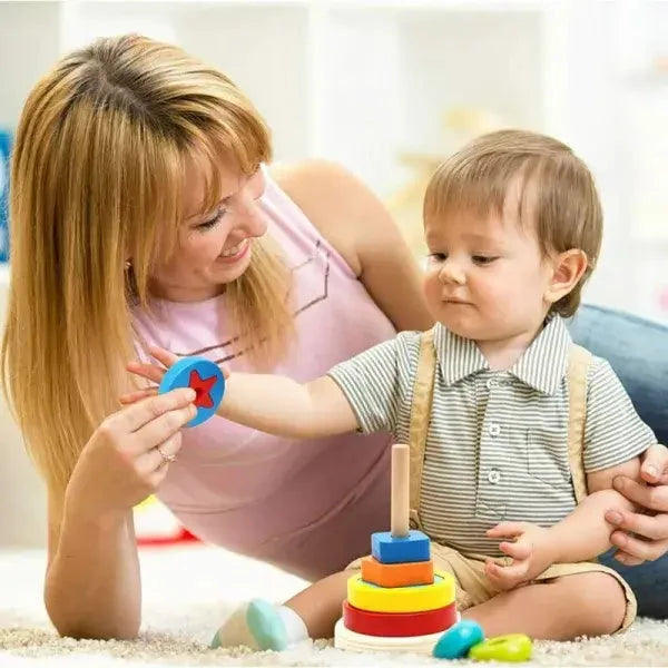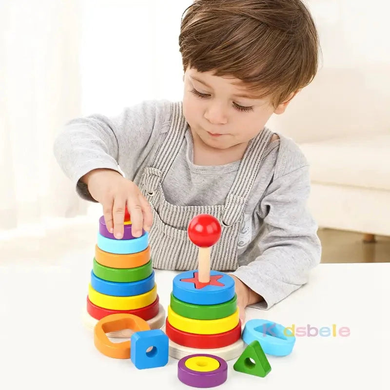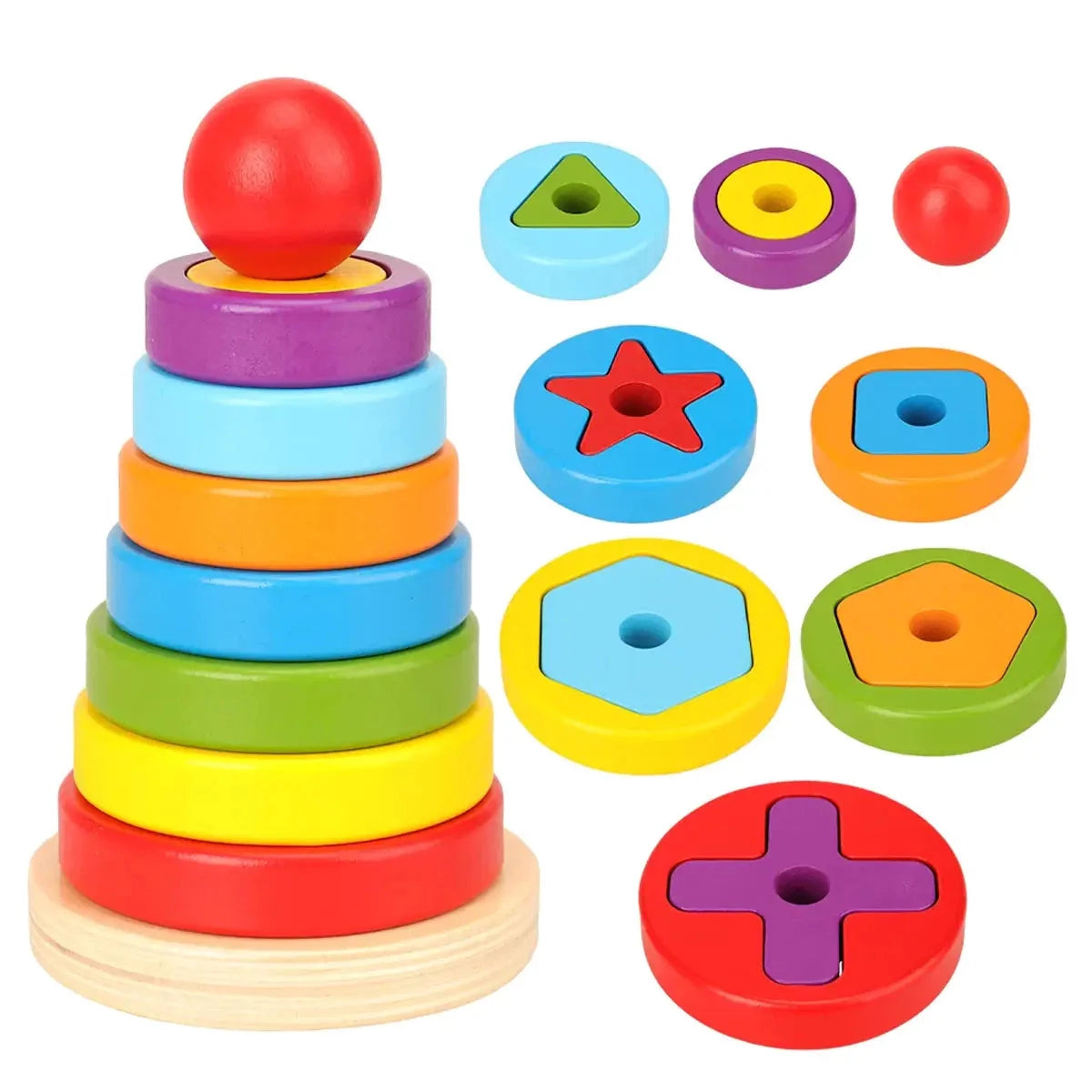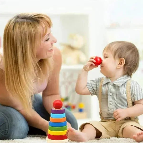 Dubbelstaplat regnbågstorn i trä | Staplingsleksaker för barn