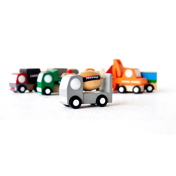 Packungsinhalt: 12 x Mini-Holzautos (Gabelstapler/Müllwagen/Tankwagen/Zementwagen/Polizeiwagen/Krankenwagen/Feuerwehrauto/LKW/Schaufelbagger/Bus/Postwagen/Fracht)