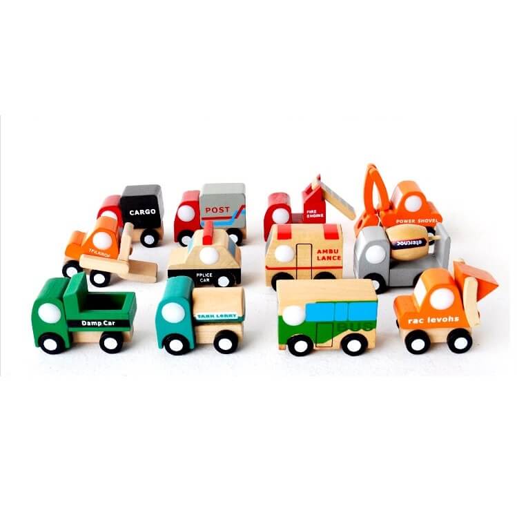 Dieses Holzauto-Spielzeugset für Kinder enthält 12 Fahrzeugtypen in verschiedenen Farben und Modellen. Es umfasst Baufahrzeuge, Verkehrslastwagen, Polizeiautos, Busse, Krankenwagen und vieles mehr. Jedes niedliche Auto hat seine besondere Funktion und seinen besonderen Stil. Die flexiblen Teile der Mini-Fahrzeuge lassen sich auf und ab bewegen und eignen sich perfekt für das Kinderzimmer. Die Spielzeugautos haben leichtgängige Räder und fördern keinen Widerstand.