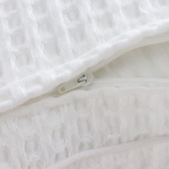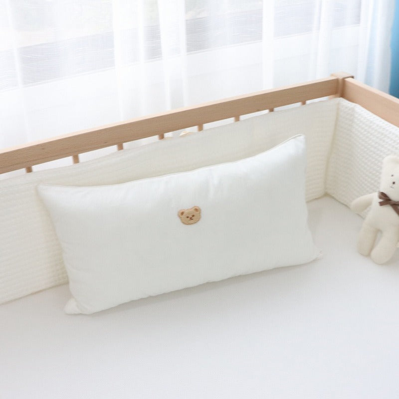 Soft and fluffy baby pillows in rectangular and cylindrical shapes provide cozy support and cushioning for a baby's head and body while preventing head bumps or tipping over the bed. Made of 100% cotton fabric in plain and waffle weave texture with a embroidered bear motif. These snuggly bedside pillows are not just soothing and comforting for babies but also perfect for tummy time play.