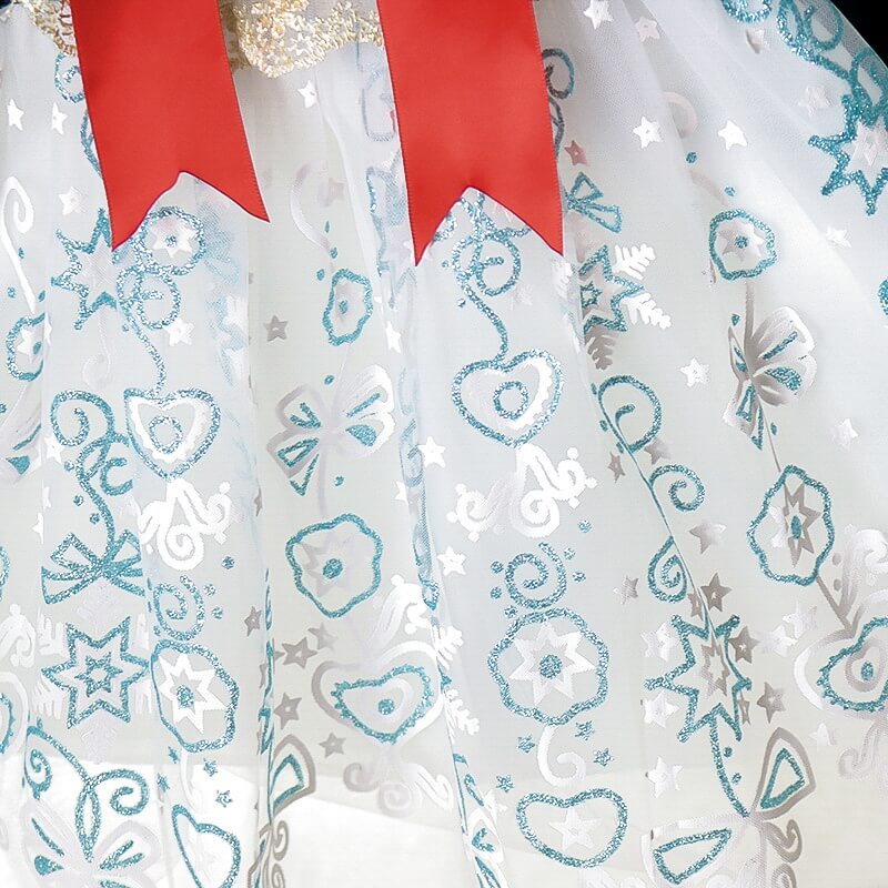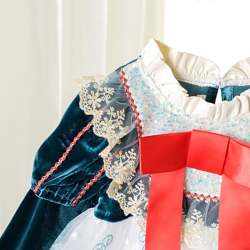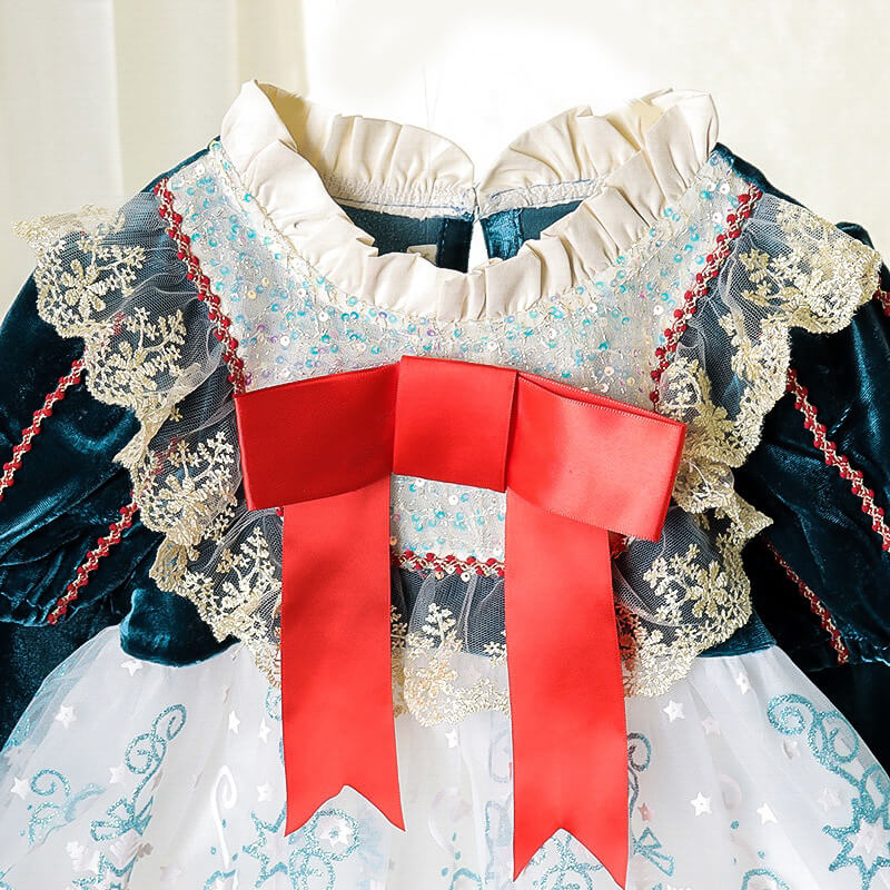 Une belle robe en velours bleu pour bébé fille avec du tulle blanc et un nœud rouge. Jupe légèrement affichée doublée d'une épaisseur de tulle à motif imprimé métallisé scintillant.