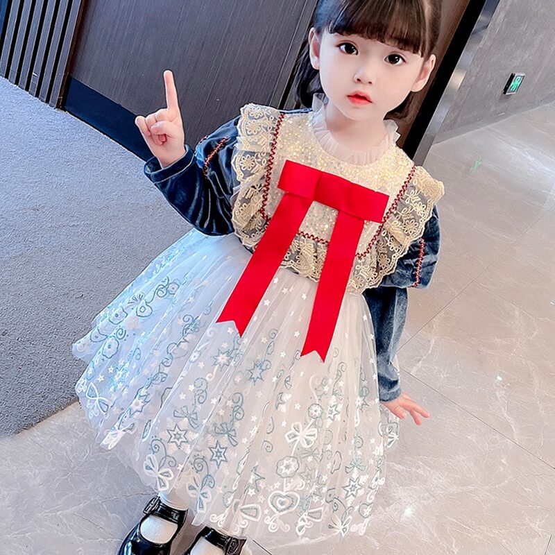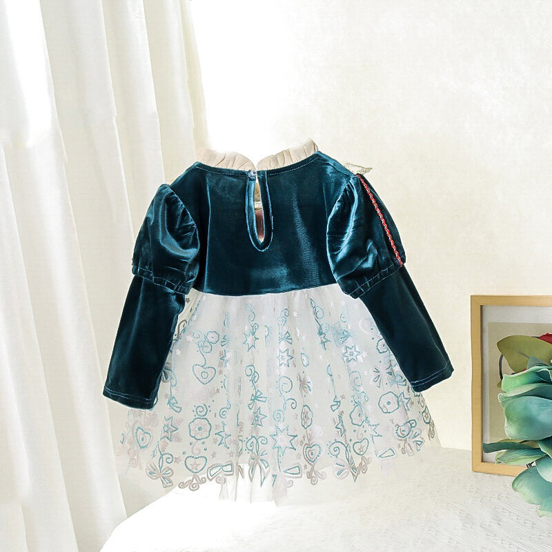 Robe en velours bleu scintillant brodé de dentelle pour petites filles