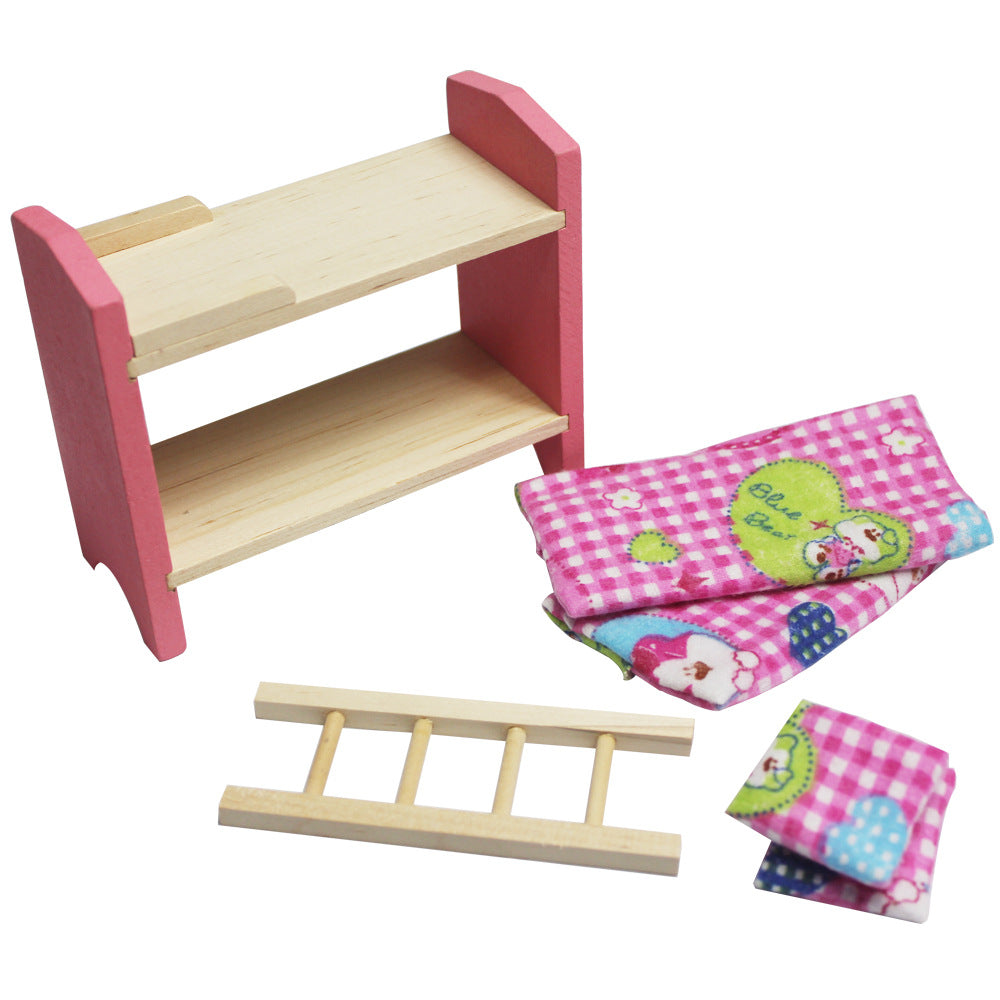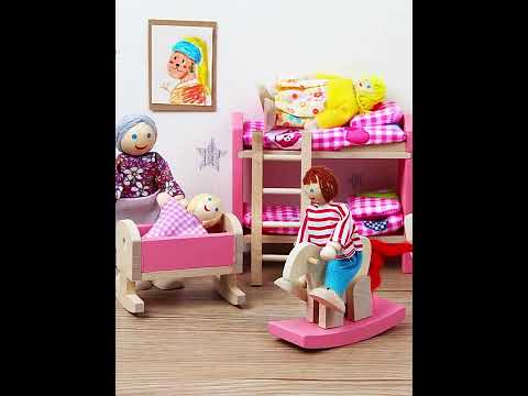 Laissez vos enfants vous raconter des histoires de jeu avec le mini-ensemble de jouets meubles dans une maison de jeu modèle. Cet ensemble de luxe de mini jouets en bois pour maison de poupée surprendra tous les enfants. Chaque pièce est fabriquée avec du bois de première qualité et peinte avec des peintures non toxiques. Cet ensemble de jouets pour enfants comprend un lit superposé avec une échelle, deux poupées, deux chaises, un cheval à bascule et un berceau pour bébé.
