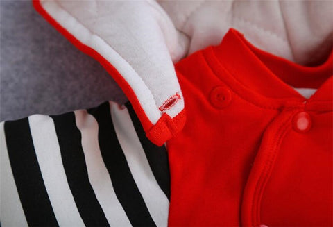 3-delige winteroutfitset met jumpsuit met capuchon en footies. Een warme en ademende winterbovenkleding voor babyjongens en -meisjes. Gestreept in blauwe, bruine, zwarte patronen, jumpsuit met capuchon aan de voorkant voor goede warmte. Het is speciaal ontworpen met rekbare stof voor je peuter, zodat hij kan rennen, kruipen en spelen zonder ongemakkelijk strak te zitten!