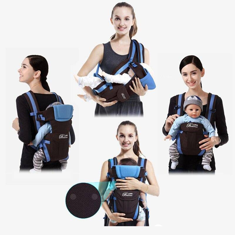 Vier draagopties voor baby's: naar binnen gericht, naar buiten gericht, op de rug dragend en kruisdragende draagzak voor pasgeborenen.