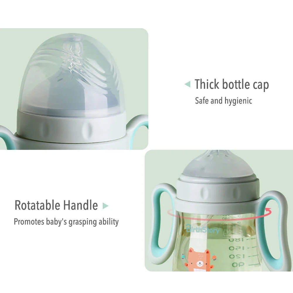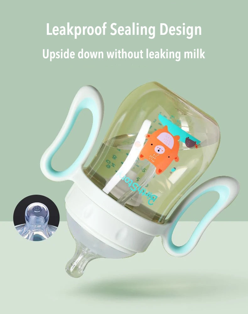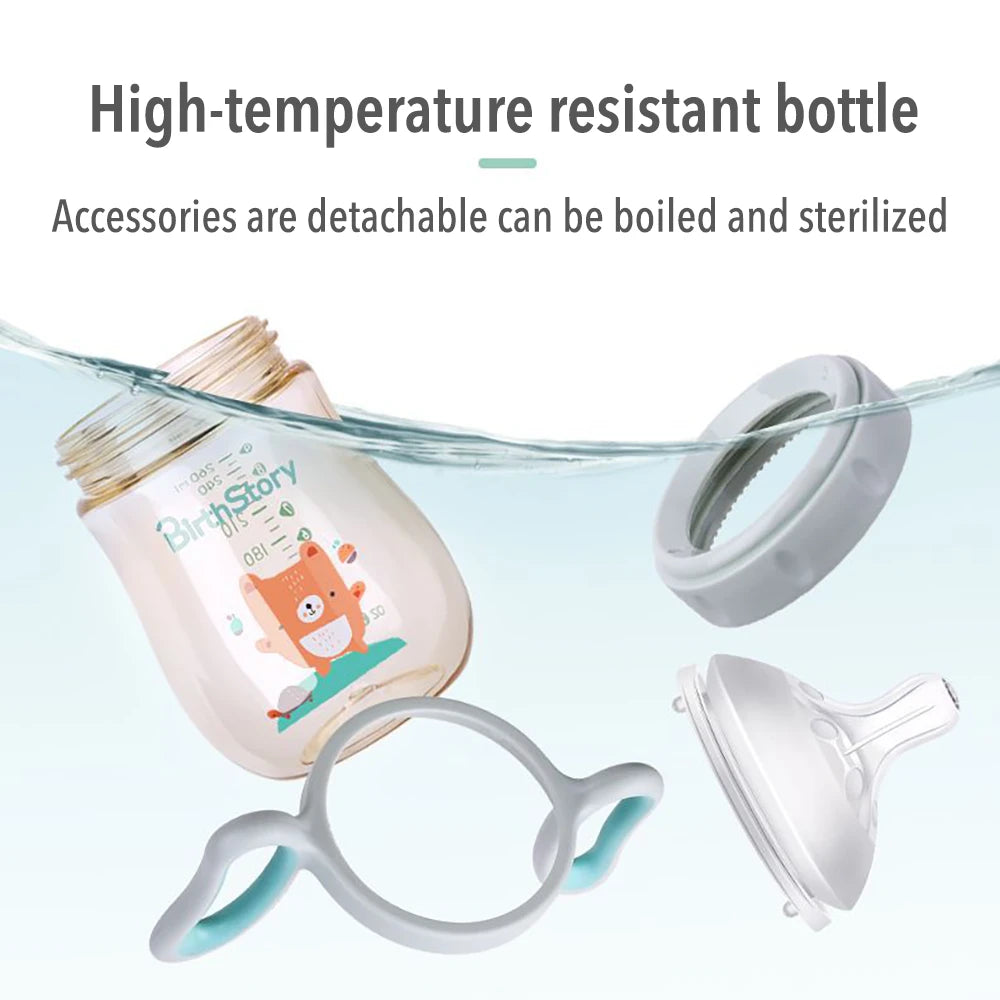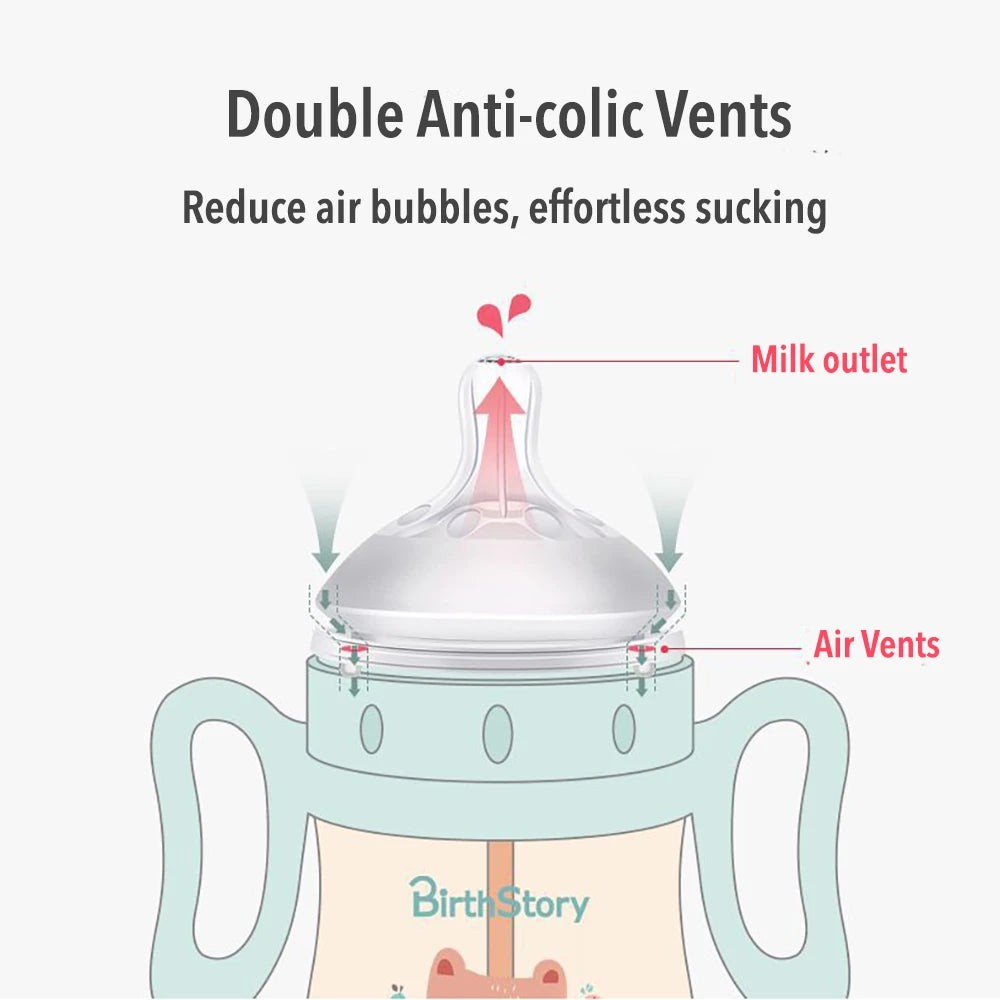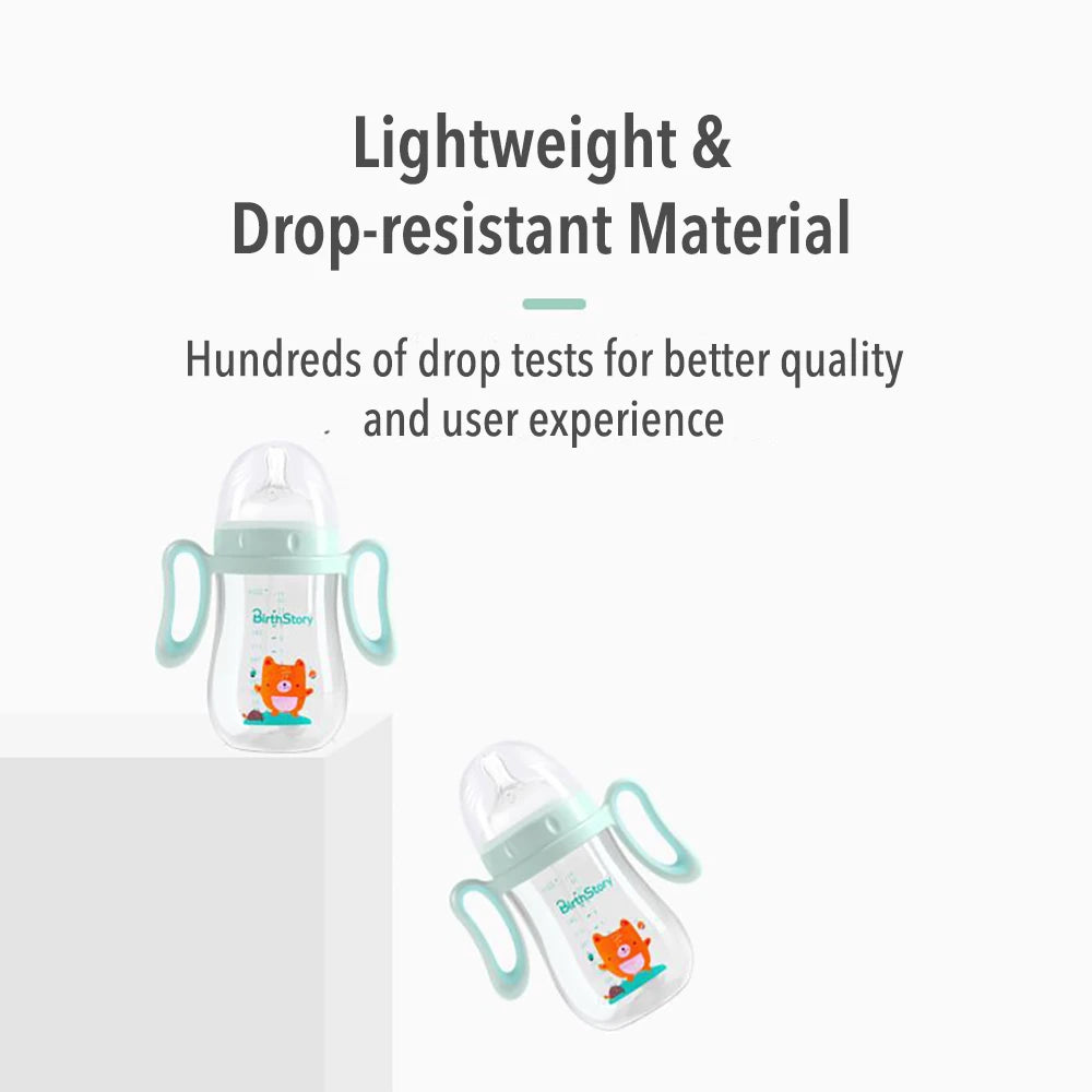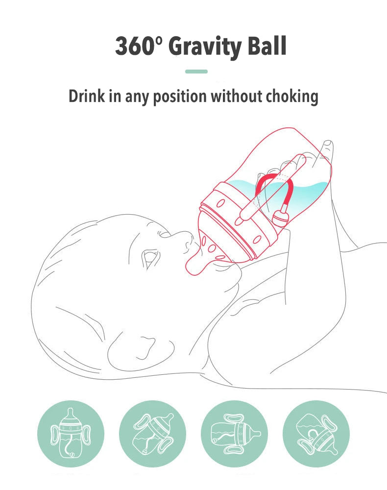 Babyfles voor baby's met een afneembaar handvat en een optionele zwaartekrachtbal zorgen voor gemakkelijk drinken in elke positie zonder te stikken. Gemaakt van slagvast en BPA-vrij materiaal met antikrampjesdesign. De zachte fopspeen met ventilatieopeningen zorgt voor luchtcirculatie en vermindert luchtbellen in de melk, waardoor baby's geen opgeblazen gevoel krijgen. Het is lekvrij wanneer het valt of ondersteboven wordt gehouden, waardoor het een betrouwbare keuze is voor baby's van verschillende leeftijden.