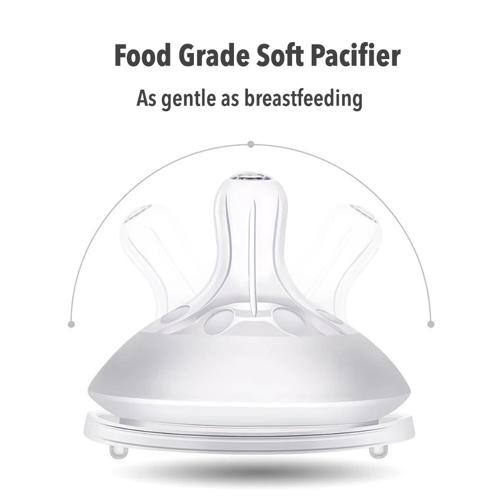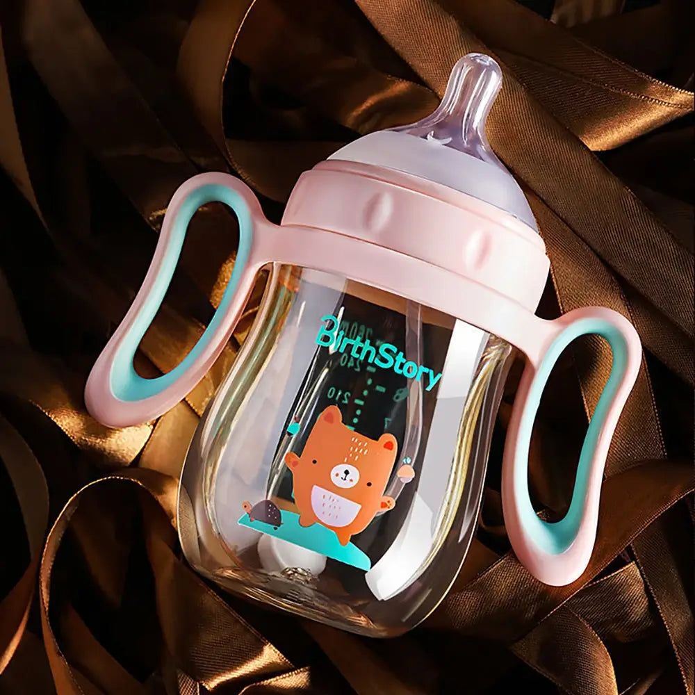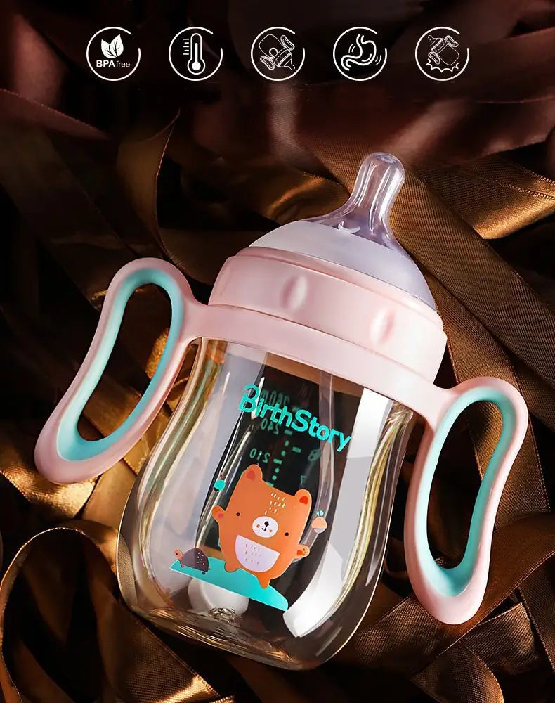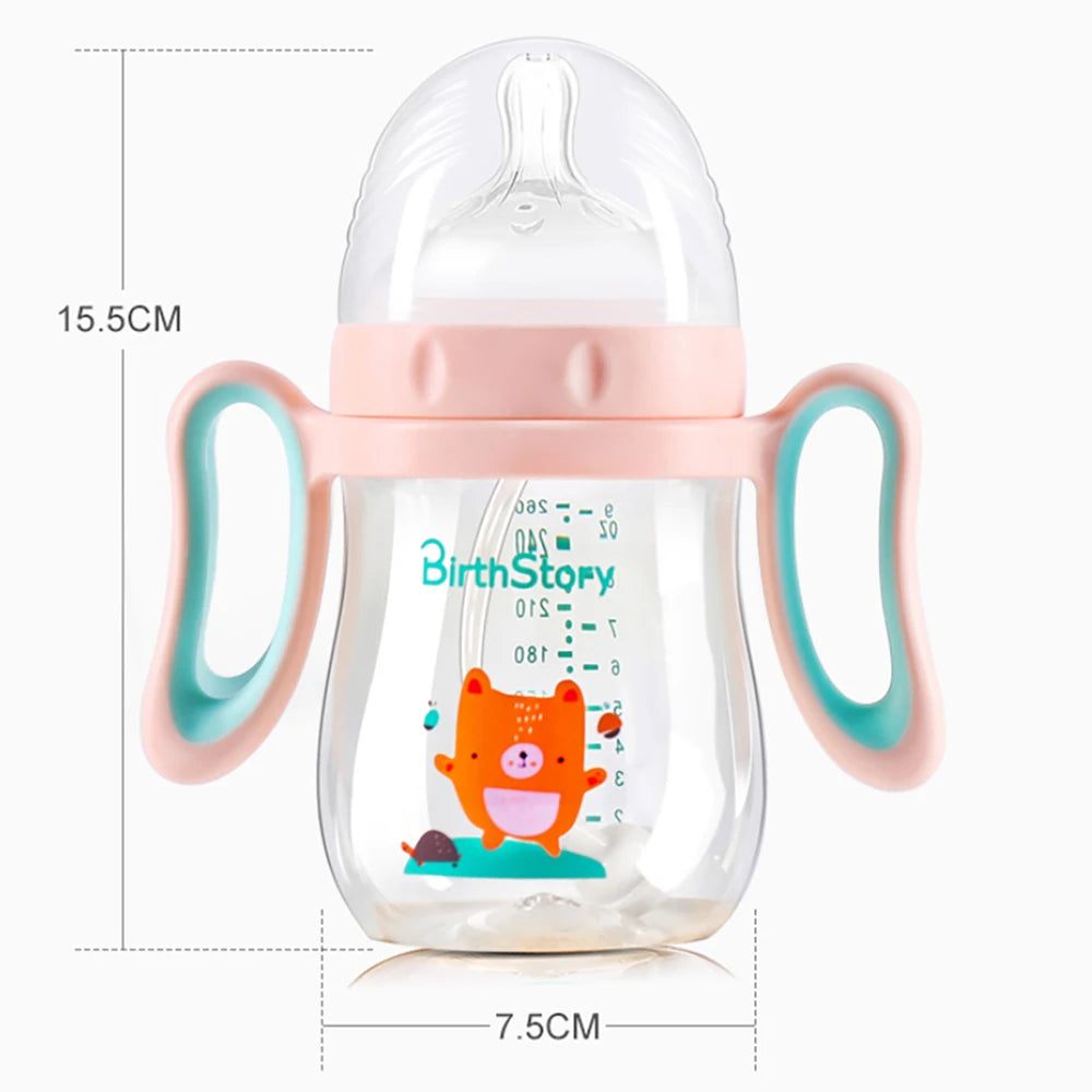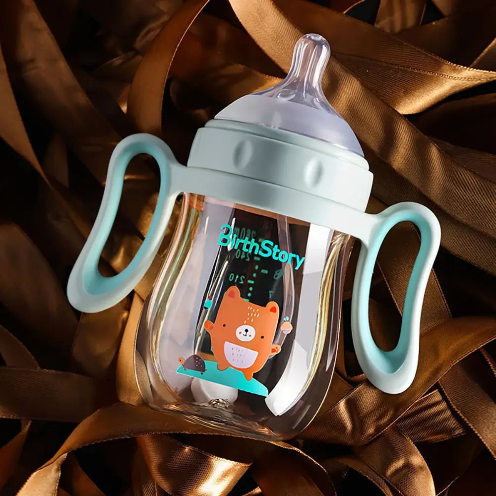 Babyfles voor baby's met een afneembaar handvat en een optionele zwaartekrachtbal zorgen voor gemakkelijk drinken in elke positie zonder te stikken. Gemaakt van slagvast en BPA-vrij materiaal met antikrampjesdesign. De zachte fopspeen met ventilatieopeningen zorgt voor luchtcirculatie en vermindert luchtbellen in de melk, waardoor baby's geen opgeblazen gevoel krijgen. Het is lekvrij wanneer het valt of ondersteboven wordt gehouden, waardoor het een betrouwbare keuze is voor baby's van verschillende leeftijden.