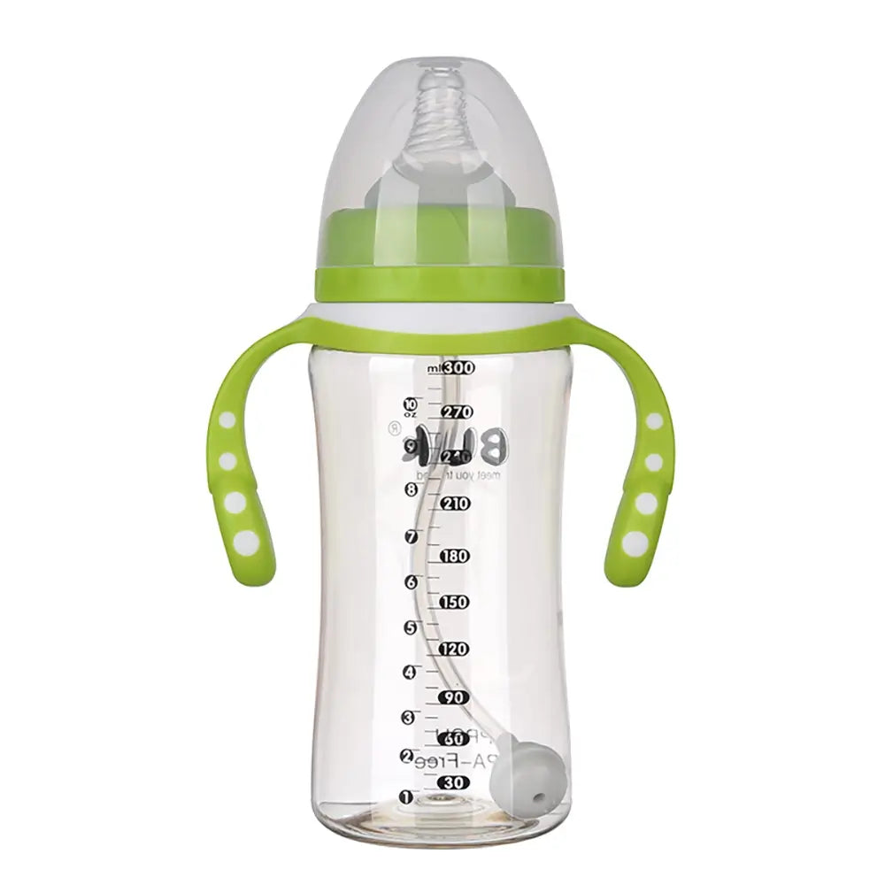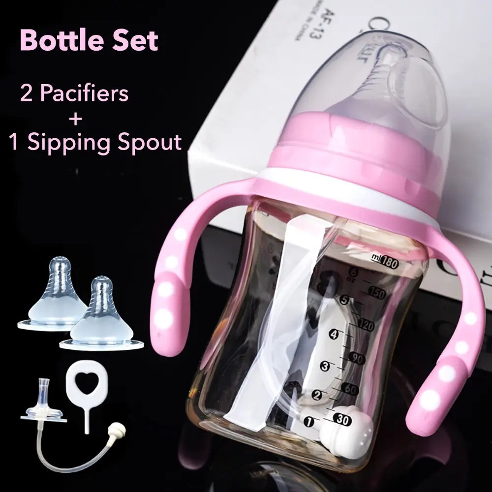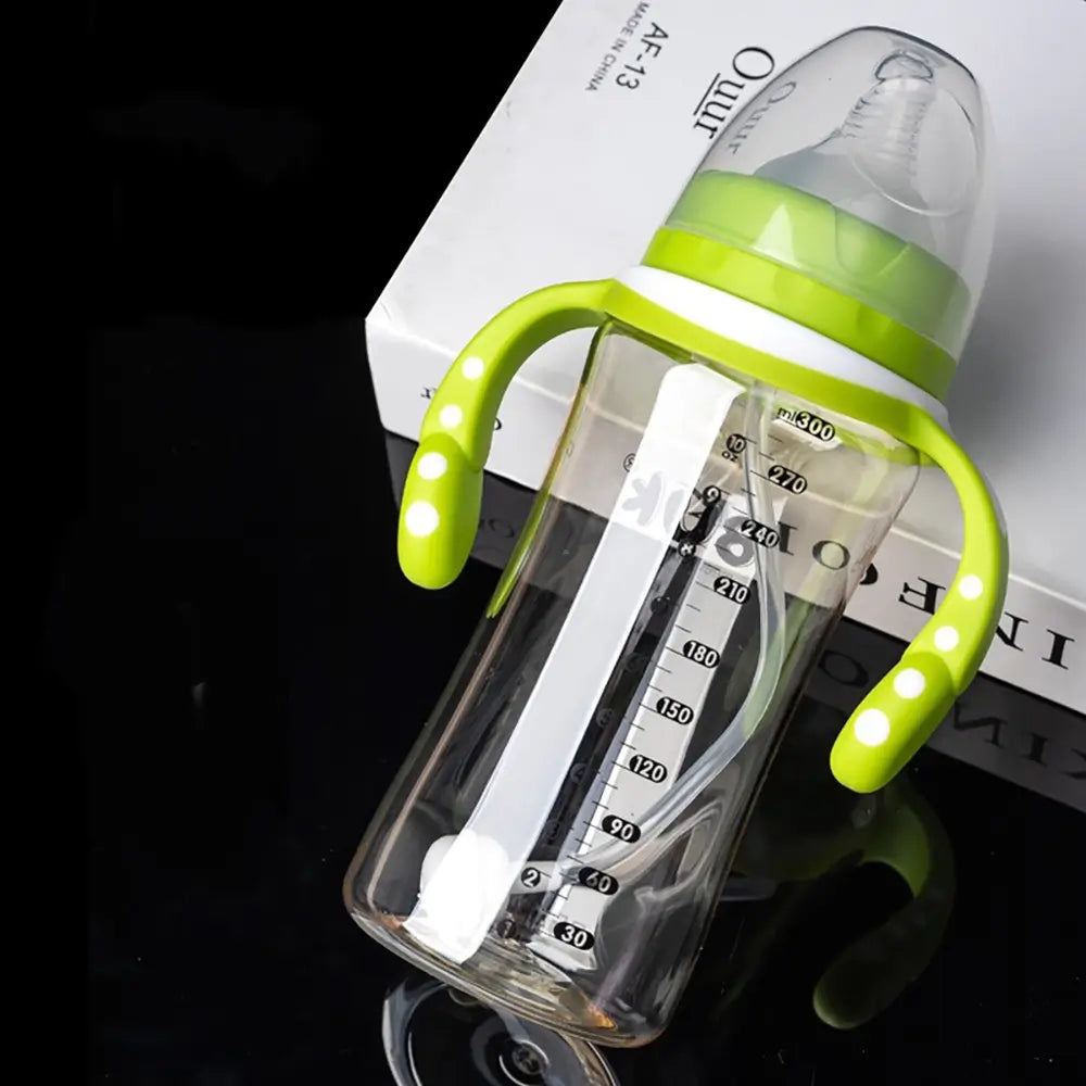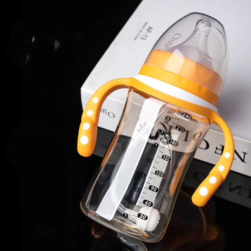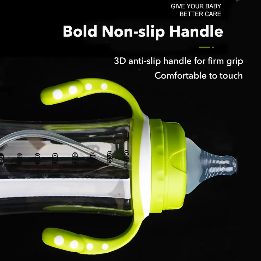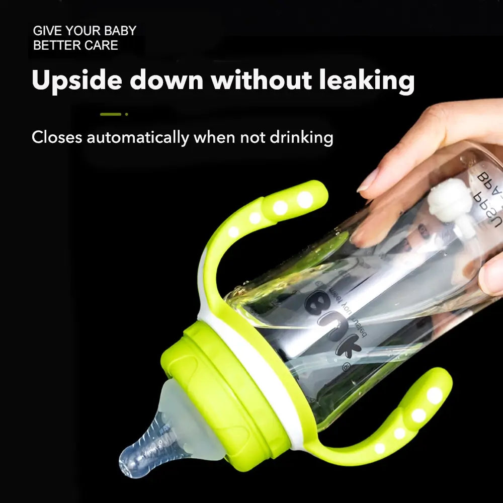 Premium babyfles voor comfortabel voeden van je kleintje. Het is gemaakt van sterk en duurzaam PPSU-materiaal en heeft een anti-zwaartekrachtbal en gebogen handvatten, waardoor het drinken van melk gemakkelijk en comfortabel is in elke houding.