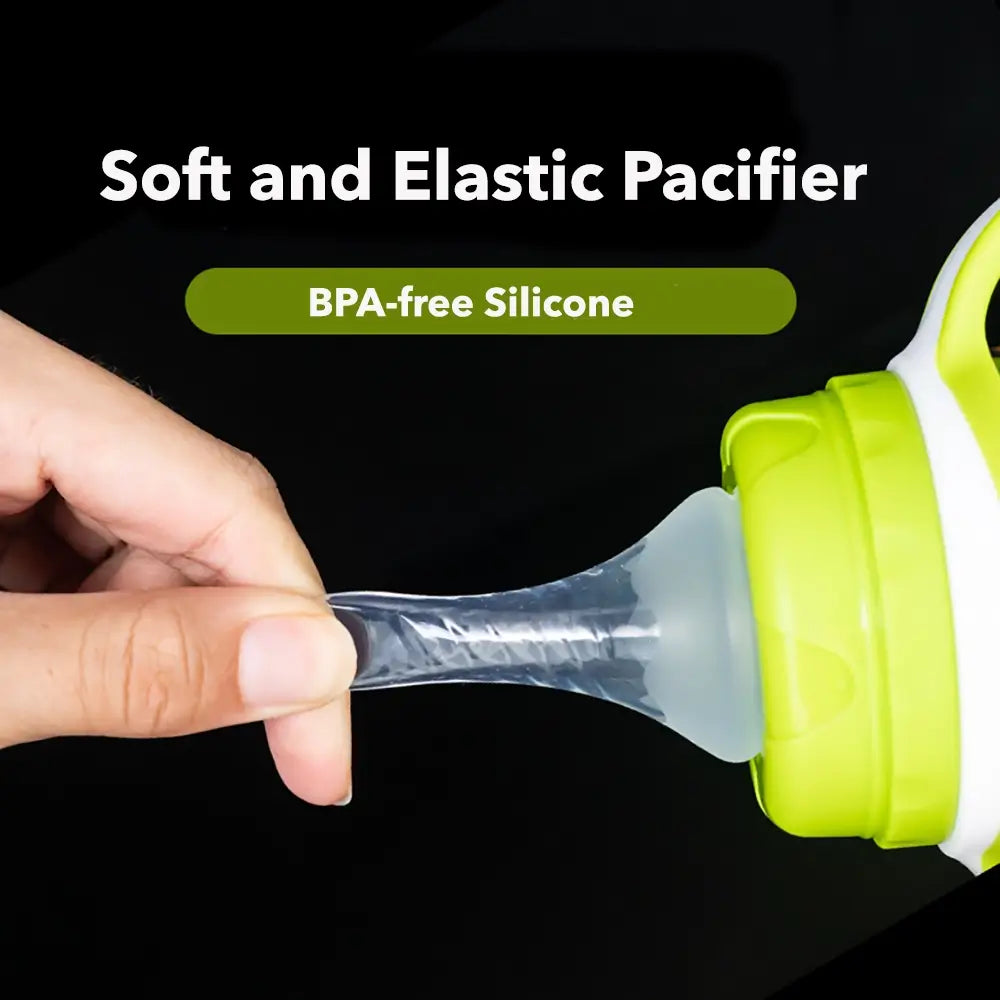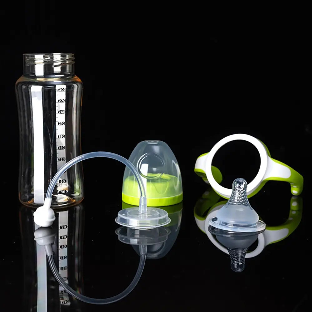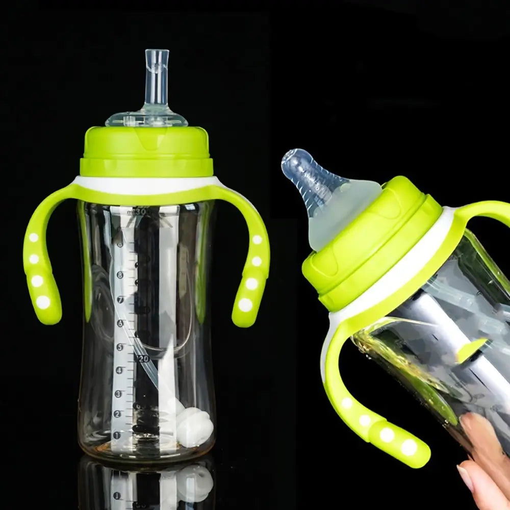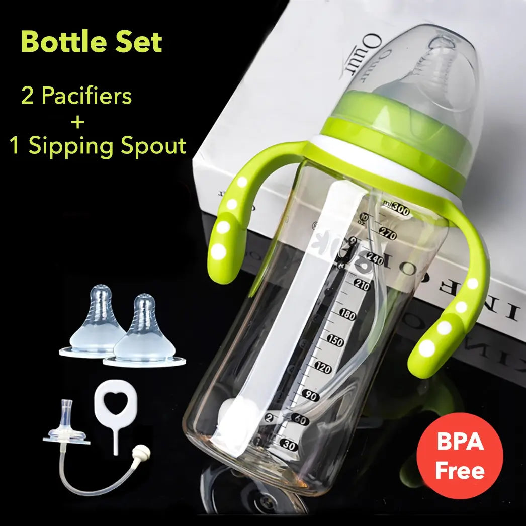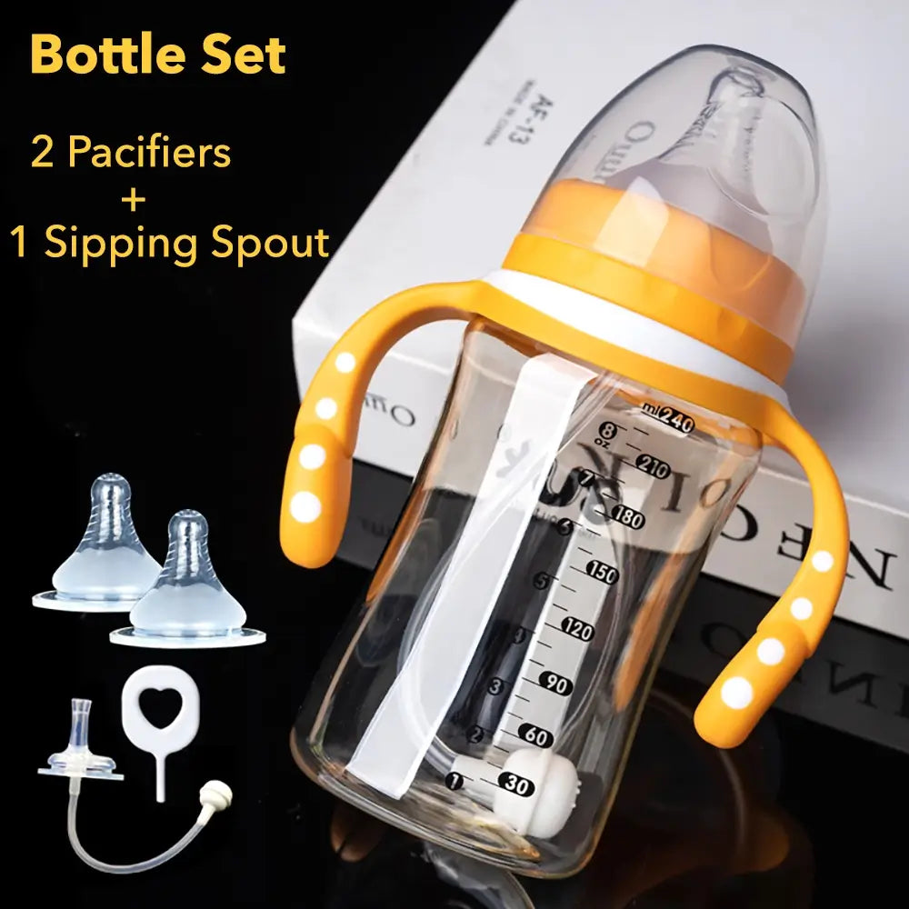 Premium babyfles voor comfortabel voeden van je kleintje. Het is gemaakt van sterk en duurzaam PPSU-materiaal en heeft een anti-zwaartekrachtbal en gebogen handvatten, waardoor het drinken van melk gemakkelijk en comfortabel is in elke houding.
