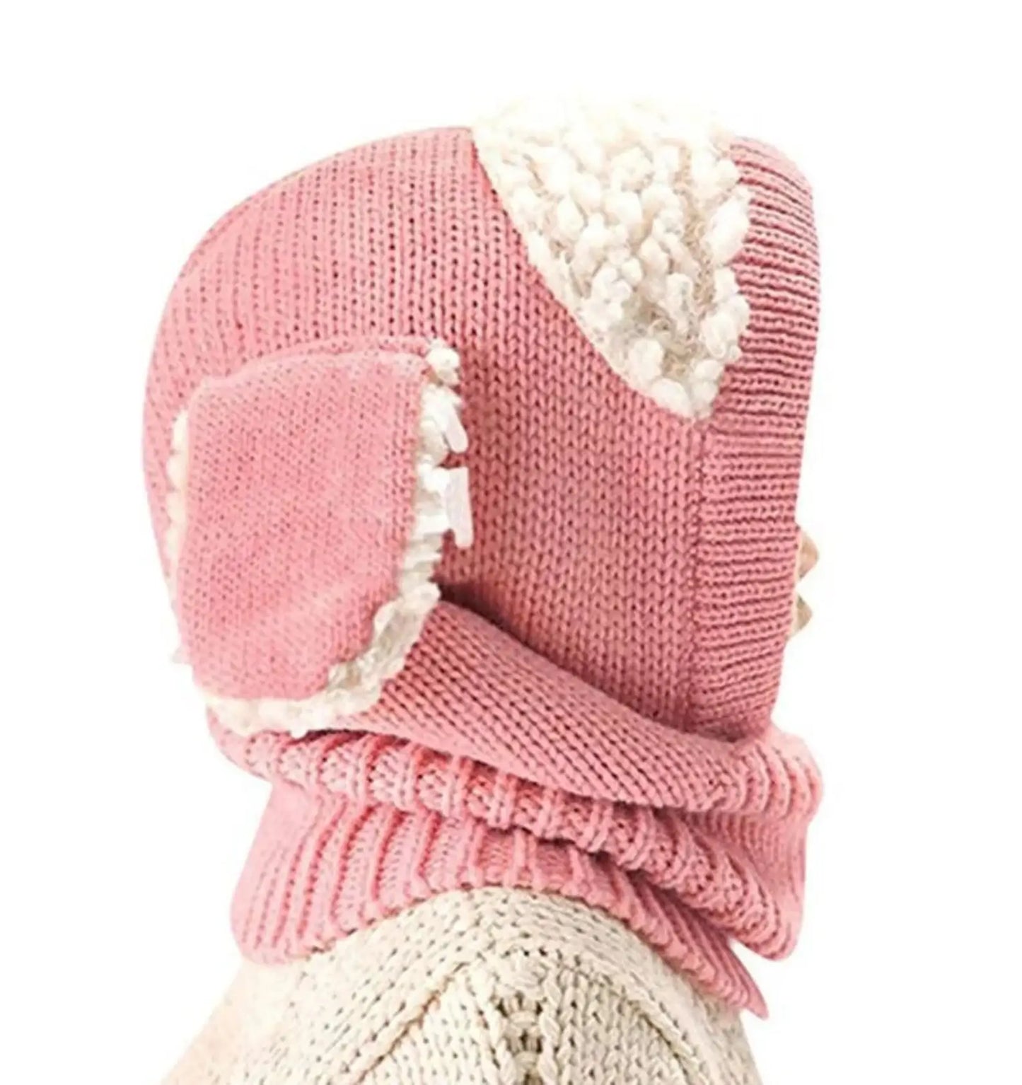 Mooie gebreide wollen muts voor kinderen met oren design. De babymuts heeft een sjaal die het gezicht en de nek bedekt en de kinderen beschermt tegen koude winterwinden. Warm en comfortabel om te dragen. Een perfect cadeau voor kinderen.