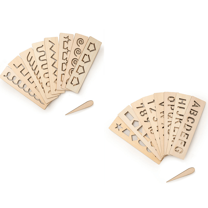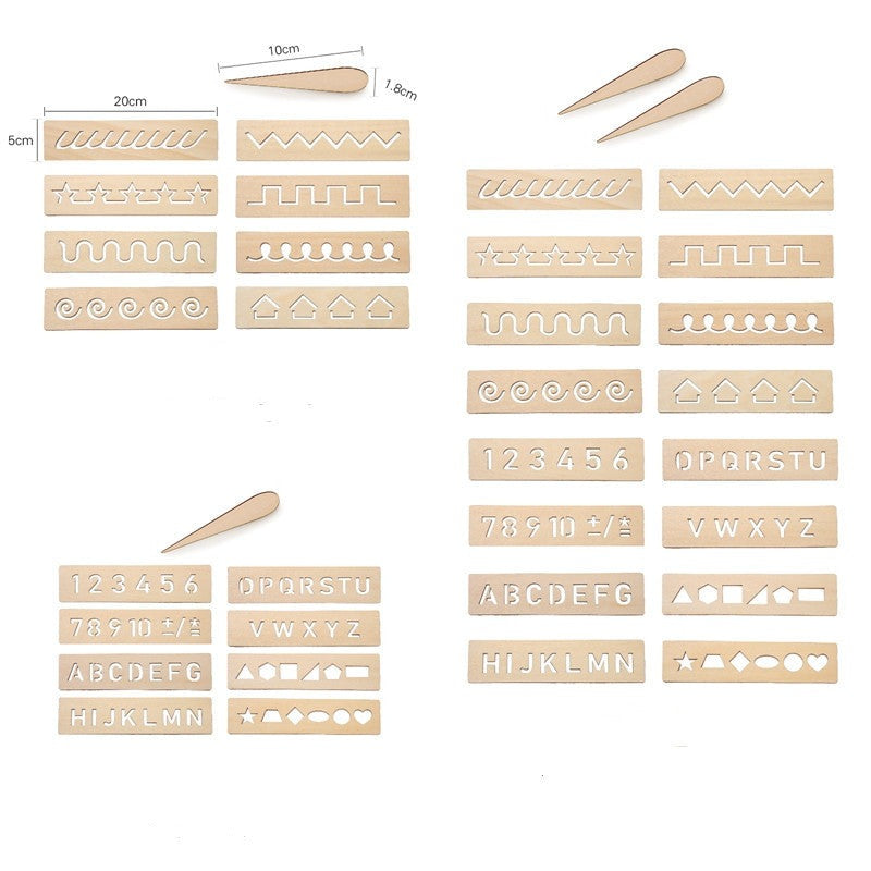 Pack van 8 houten sjablonen voor teken- en schrijftraining voor kinderen. Met deze overtreklinialen kunnen kinderen leren het potlood vast te pakken en te bewegen om verschillende patronen te schrijven of te tekenen. De stencilset is verkrijgbaar in twee stijlen: een voor het oefenen van alfabetten, cijfers en geometrische vormen en de andere voor lijnen en artistieke tekeningen.