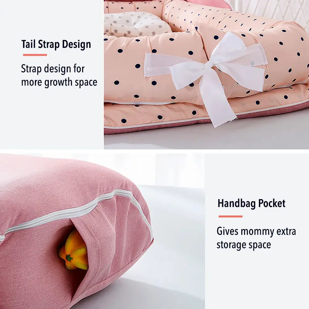 Het babynest kan in een bed tussen de ouders worden gebruikt om verstikking te voorkomen en is gemakkelijk mee te nemen en past bijna overal. Omdat hij verstelbaar is, groeit hij samen met je baby. Aanbevolen voor baby's van 0 tot 18 maanden oud.