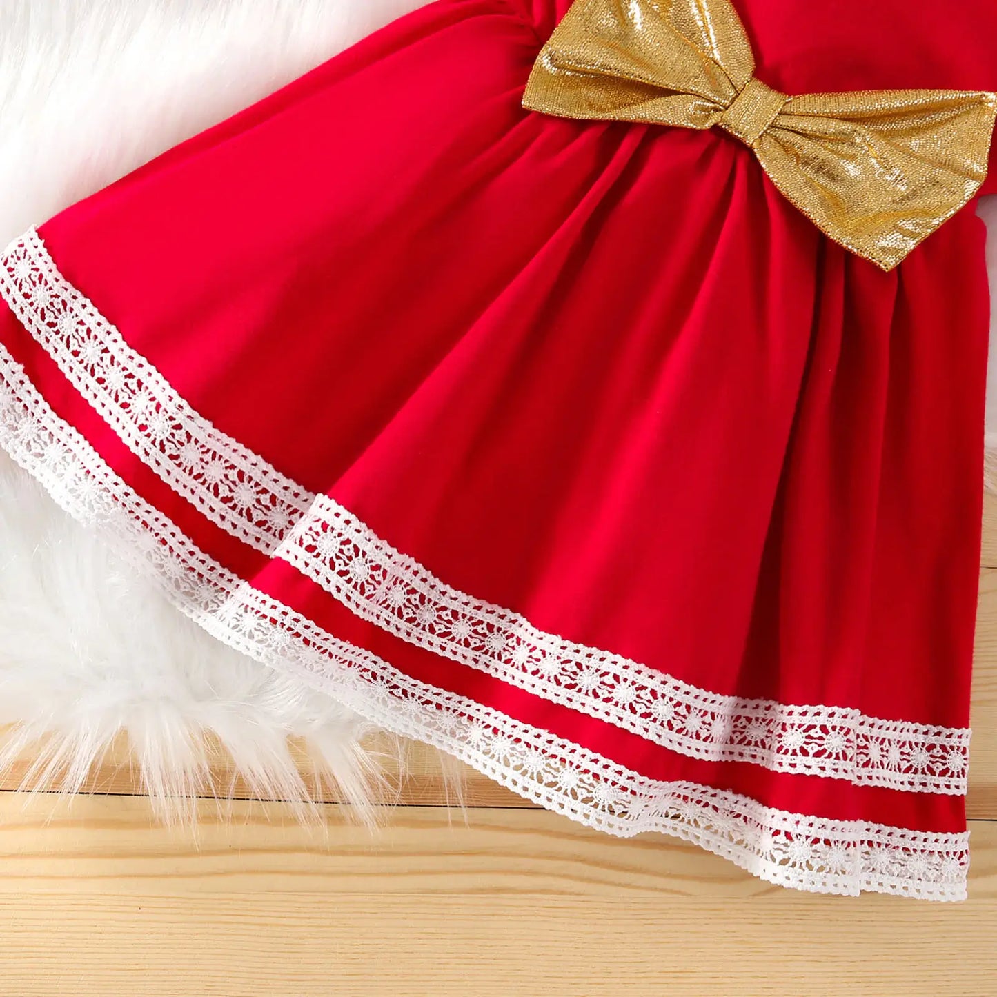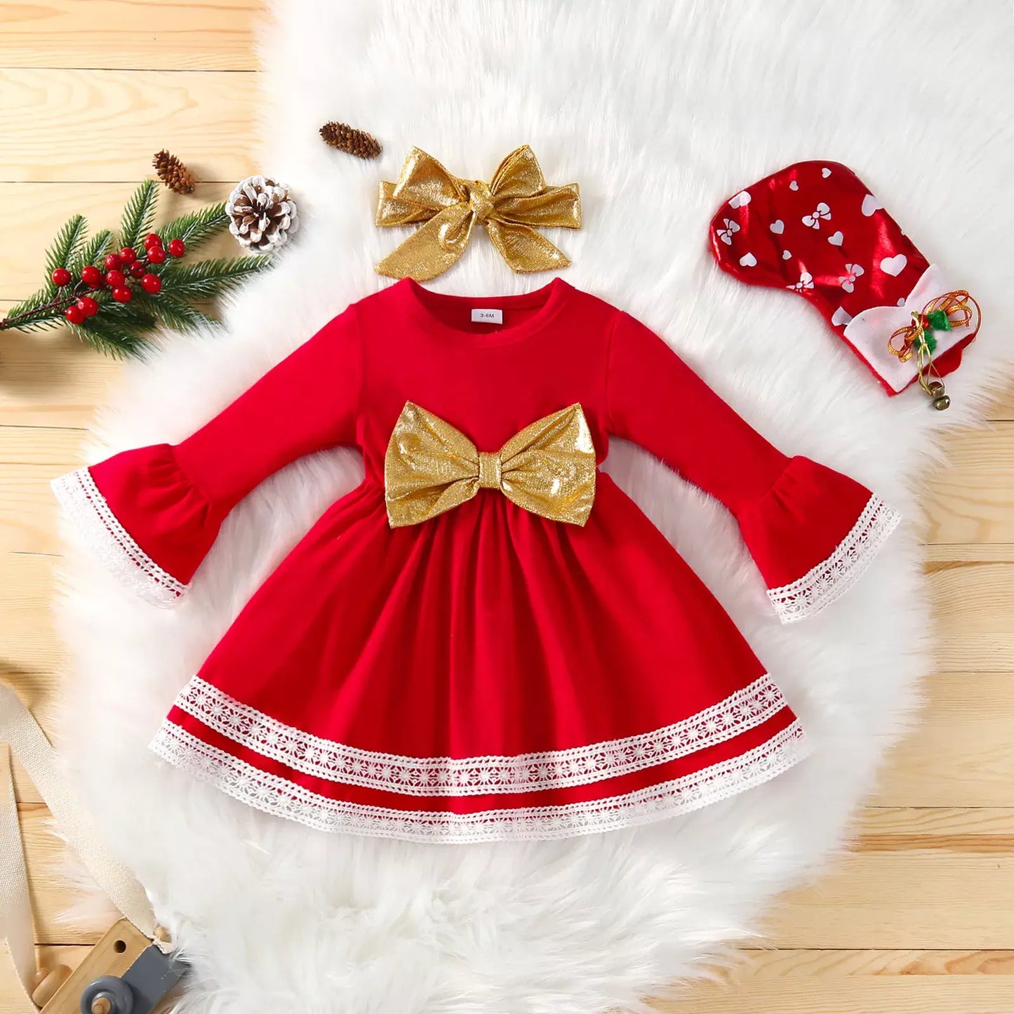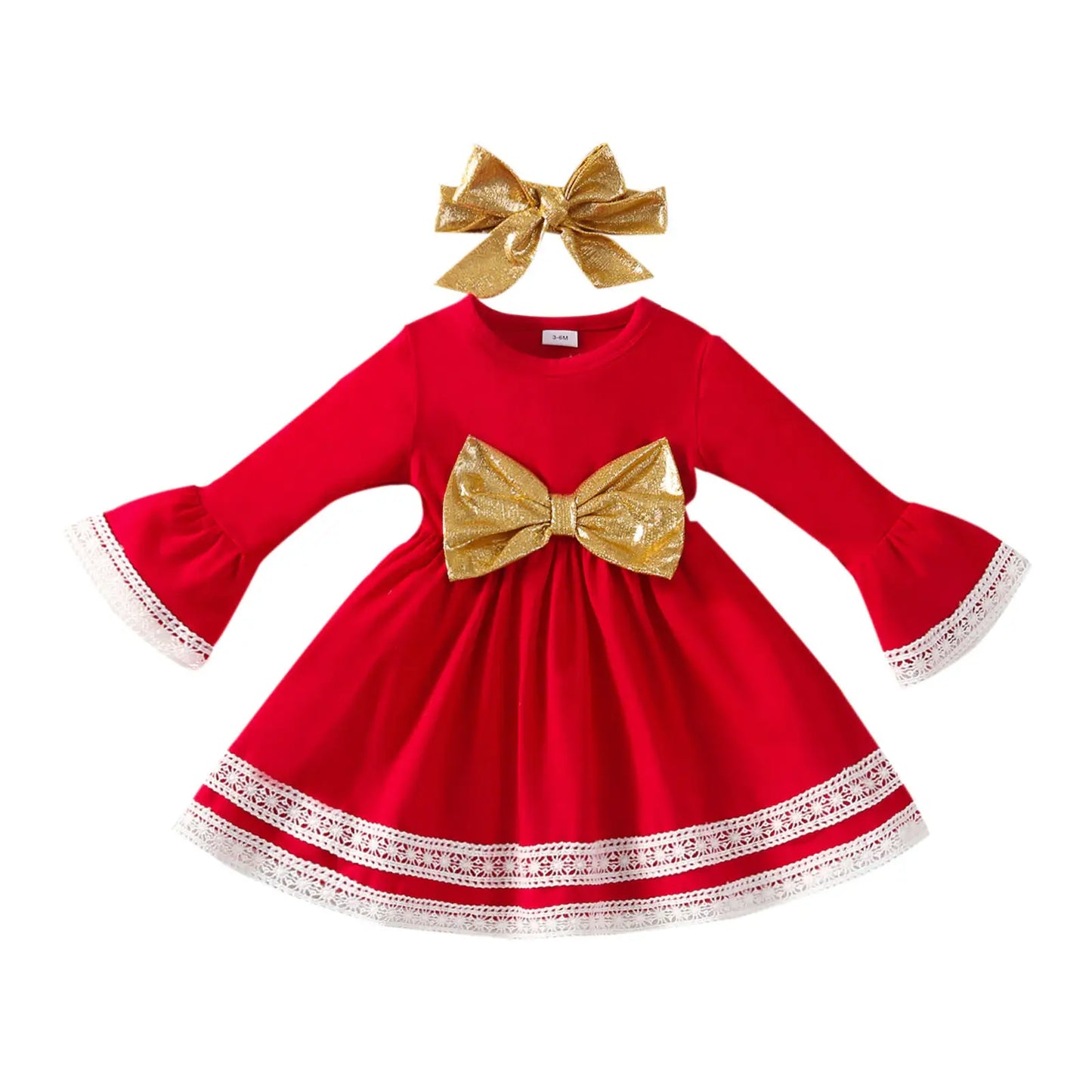 Red Christmas Dress for Baby Girls with Golden Bowknot and Headband
