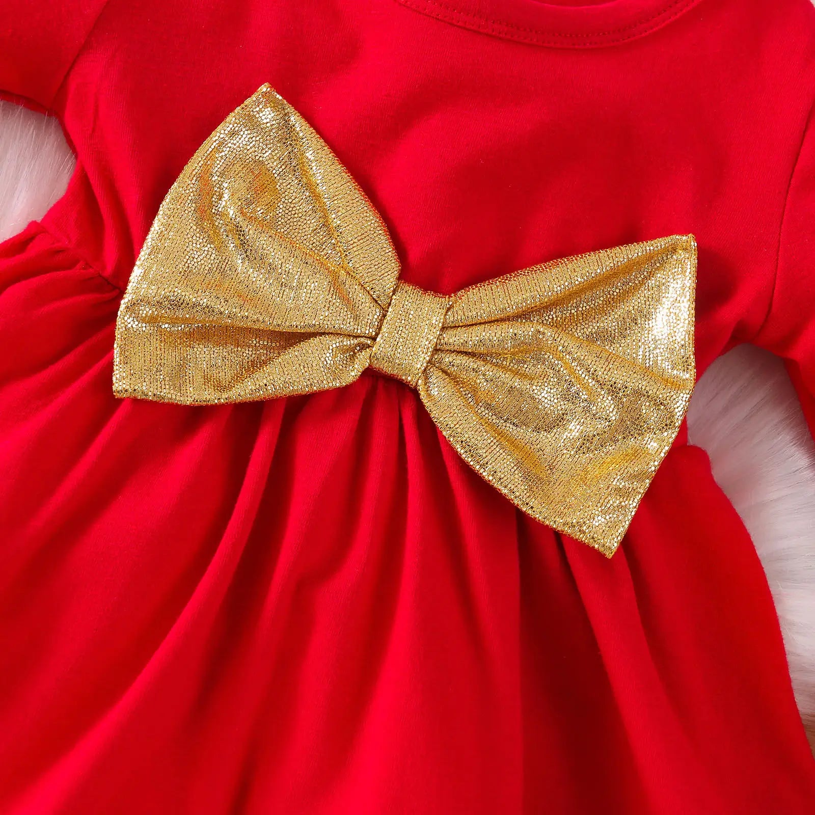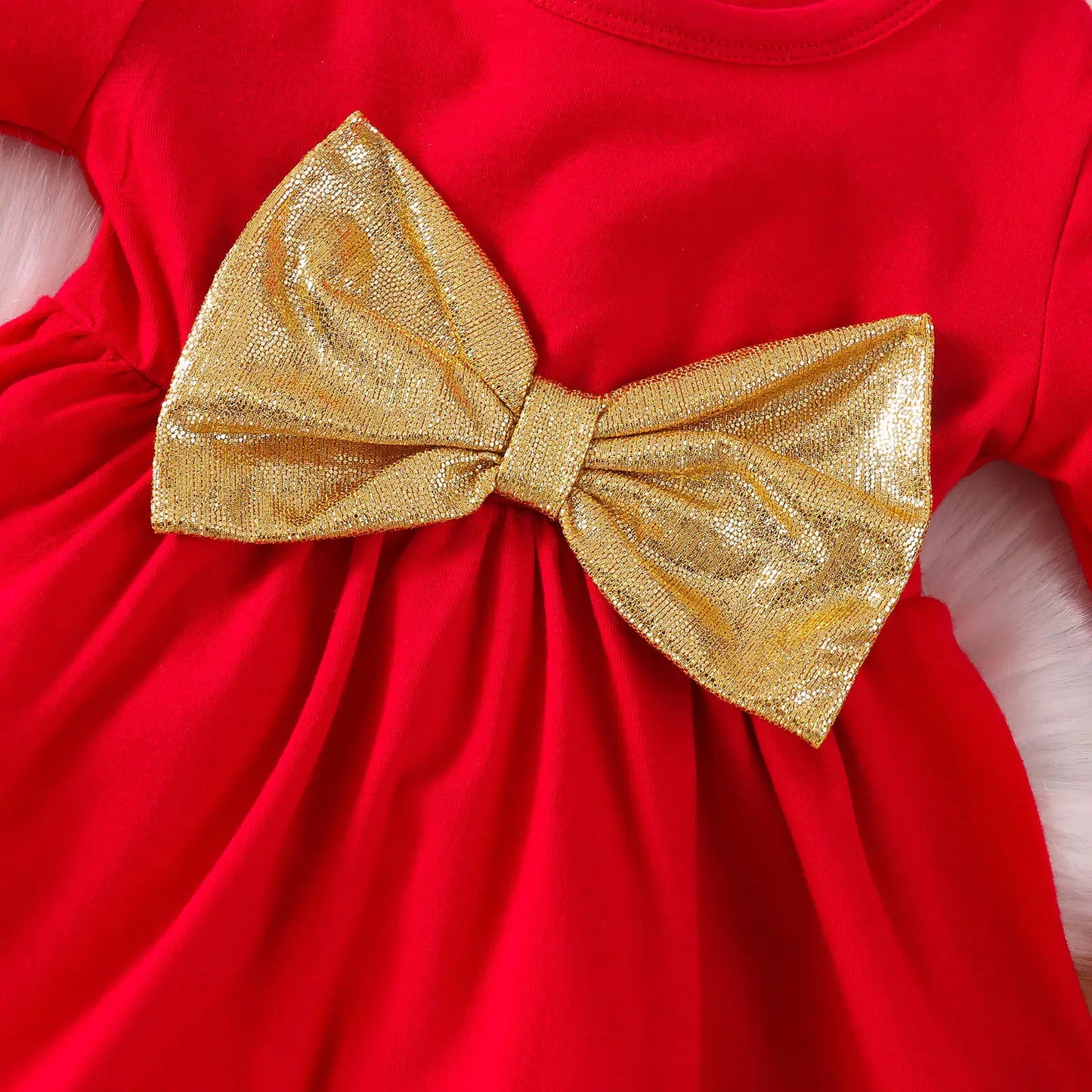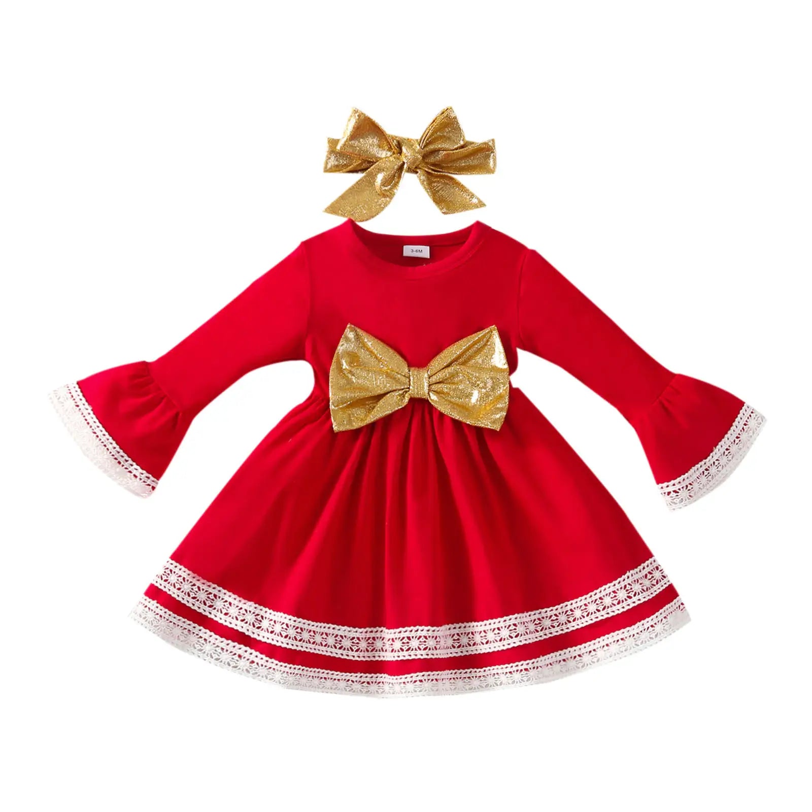 Cute Christmas dress round neck, flare sleeve pullover dress for baby girls with shiny golden bowknot and a headband. The dress is made of high-quality cotton blend fabric, which is comfortable and soft to touch and wear.
