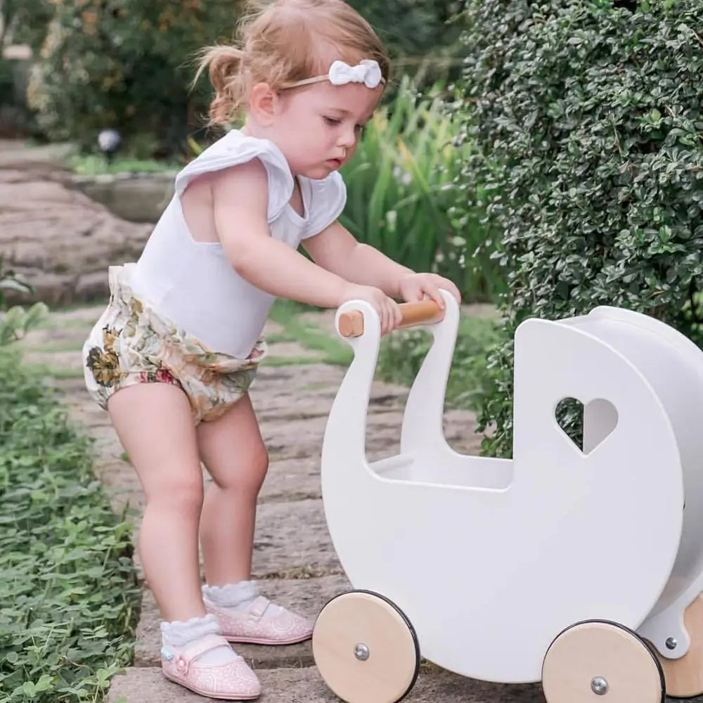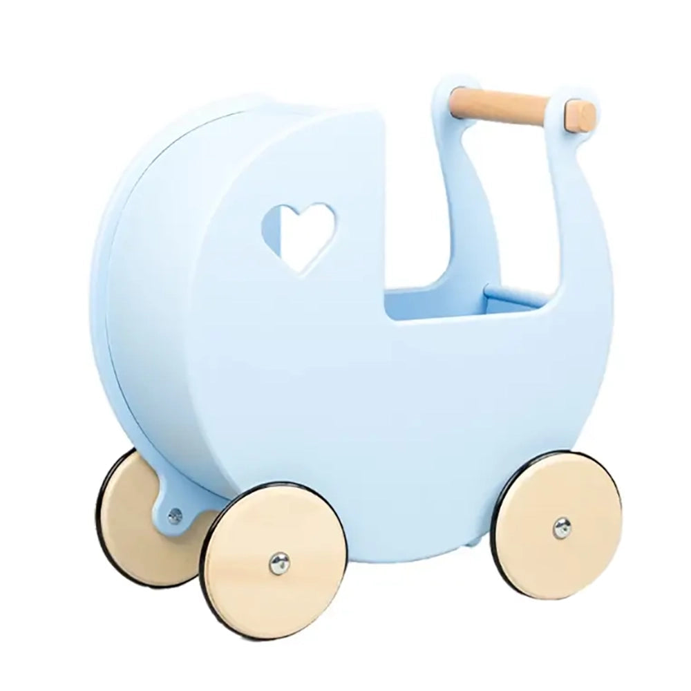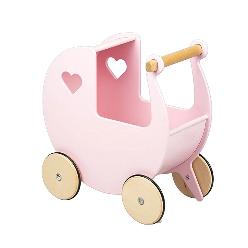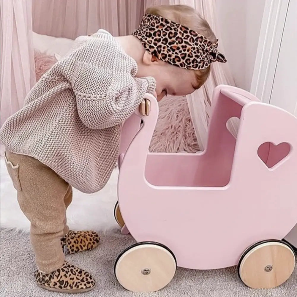 Wooden pram walker is a stylish toy push cart for kids to support them on their walking attempts and promote their motor skills. It has a large storing space, a heart window, and a little handle to encourage active playing with dolls and toys, and the rubber wheels ensure a stable and quieter motion. This wooden toy stroller is the ultimate gift that makes little kids playtime extra special.