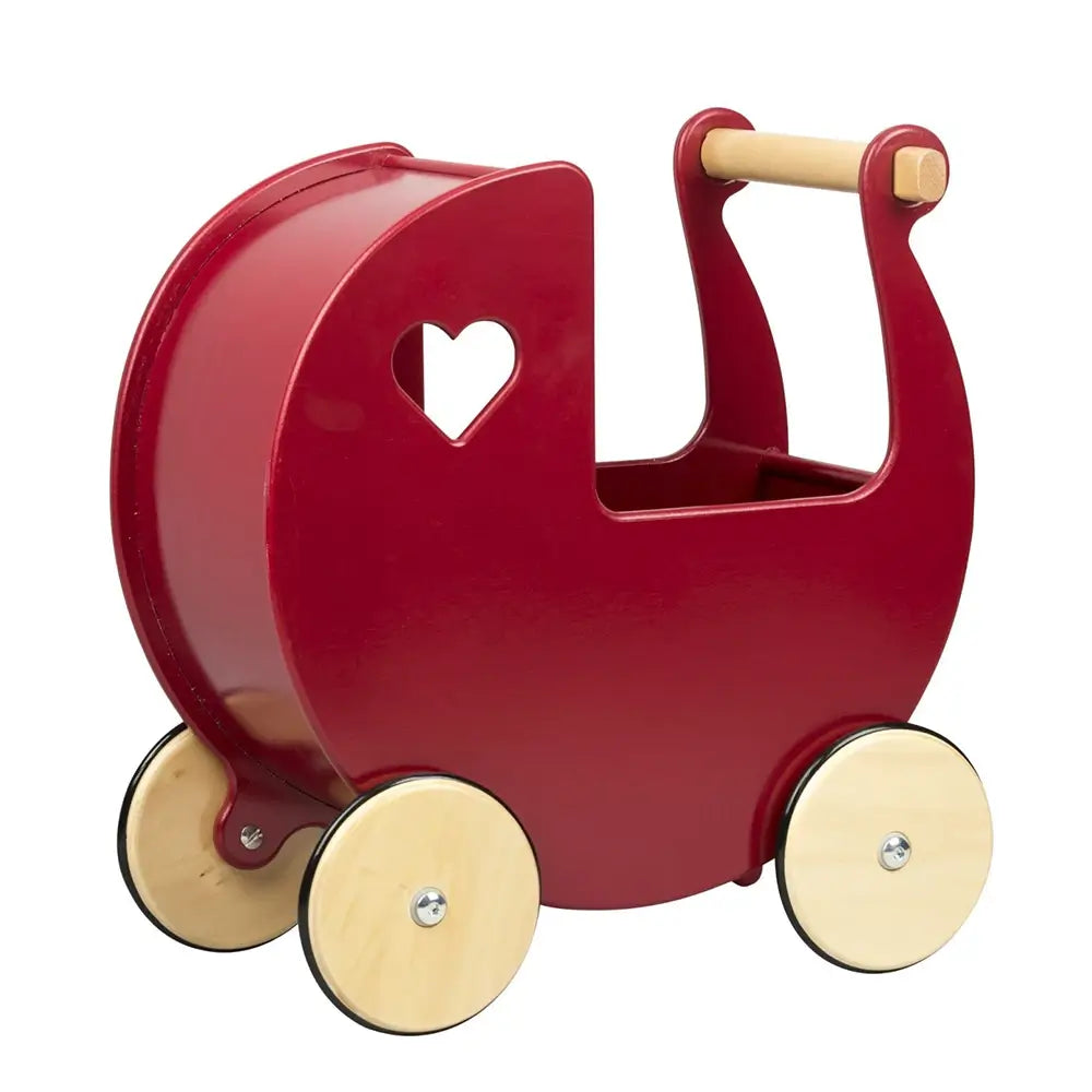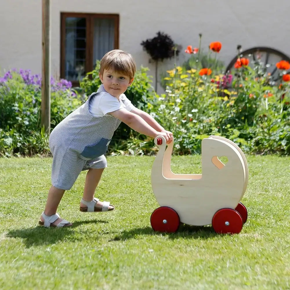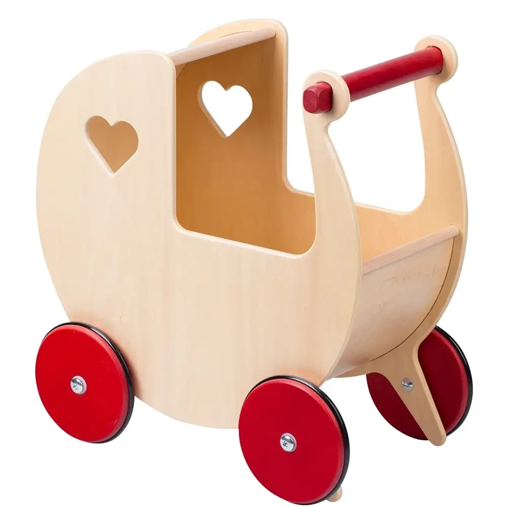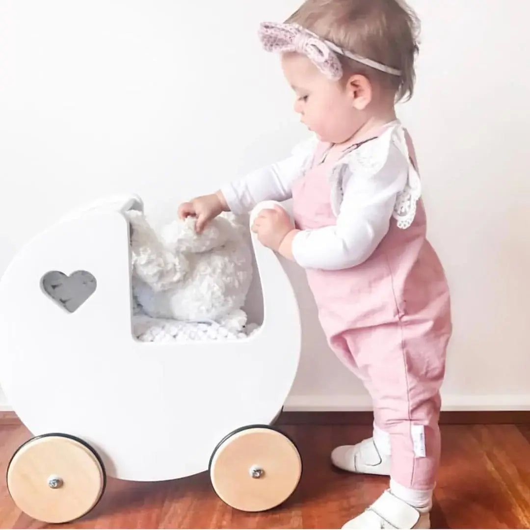 Wooden pram walker is a stylish toy push cart for kids to support them on their walking attempts and promote their motor skills. It has a large storing space, a heart window, and a little handle to encourage active playing with dolls and toys, and the rubber wheels ensure a stable and quieter motion. This wooden toy stroller is the ultimate gift that makes little kids playtime extra special.