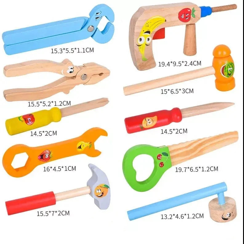 Kids' wooden toolbox toys collection is a great resource for developing children's creativity and a good distraction from electronic devices. It's not complicated to play with and easy for children to build different models and shapes as they imagine.