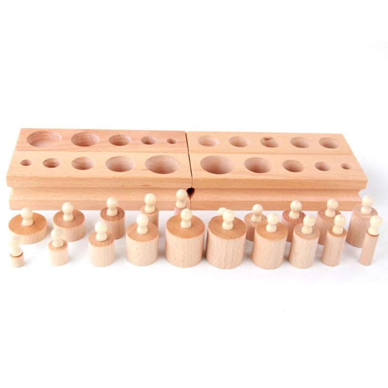 Wooden cylinder blocks set is a developmental puzzle toy for toddlers. The set includes 4 wooden blocks with holes and 20 knobbed cylinders of varying heights and diameters, helping the kids feel and learn different sizes, lengths, and thicknesses. This classic Montessori toy helps develop hand-eye coordination as kids insert the correct cylinders into the corresponding holes. An engaging educational toy for 2+ years old to match cylinders and sort by size and shape.