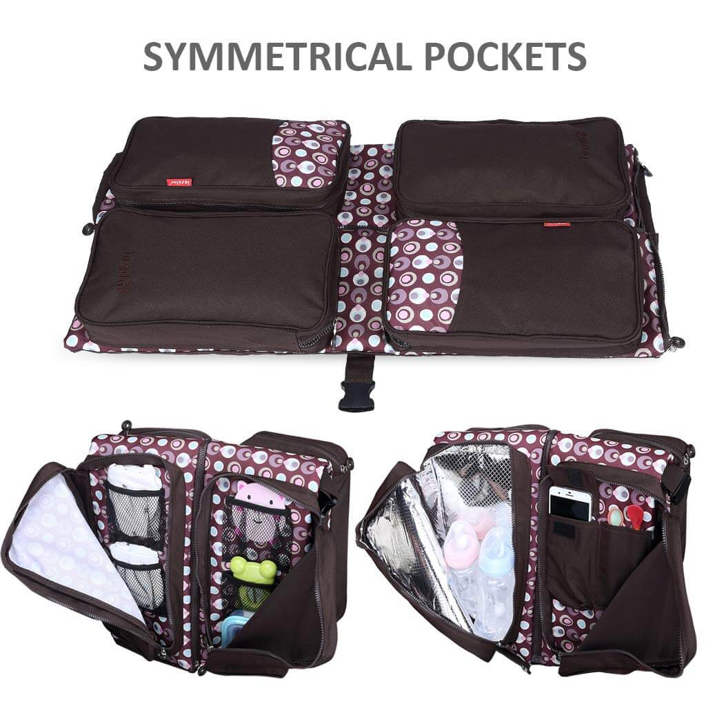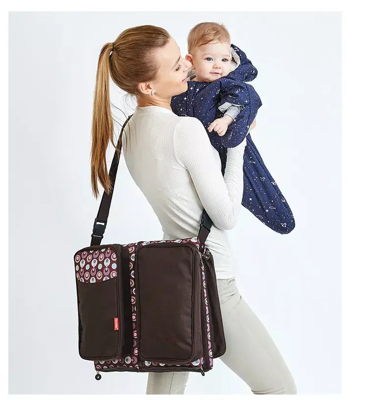 3-in-1 simple, foldable and portable mummy bag that can be used as a diaper bag, changing station, and baby crib. The baby changing bag is made of waterproof nylon fabric with high durability and is a soft and comfortable baby travel crib. This multi-purpose diaper storage bag will neatly stash away all of your baby's important stuff for food, bottles, diapers, wipes and more. Easy to carry on the shoulder or hang on the baby stroller.