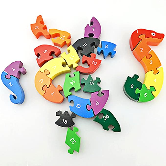 These wooden puzzles are helpful and practical toys for children to improve their learning ability by learning letters, numbers, and colors while playing. Each wooden puzzle toy set comprises 26 pcs of small woods in different colors. One side is 26 English letters, and it is 1-26 numbers on another side. It is one of the best early educational toys for small kids from 3-year old and a great activity wooden toy for 4-year-olds. Alphabet puzzle toys with small wooden blocks in various shapes. Great for learning and brain training.